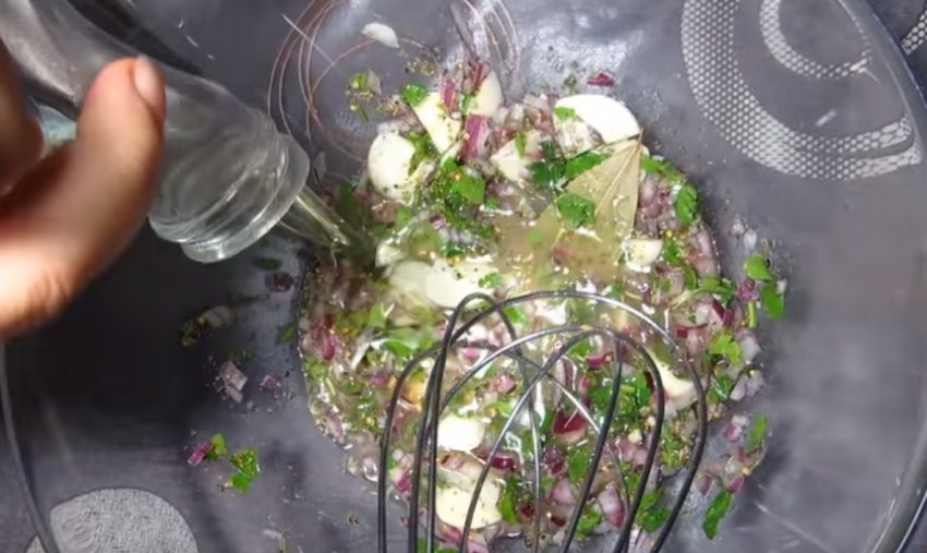 Після перемішування залиште всі інгредієнти на 5-10 хвилин для кращого поєднання смаків, а потім влийте до них рослинну олію і лавровий лист.![]()