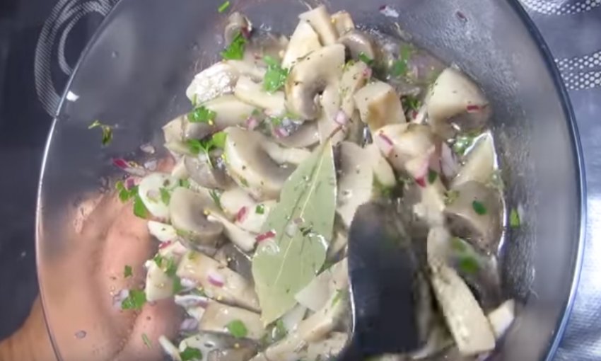 Прикрийте маринад кришкою і дайте настоятися 15-20 хвилин, після чого рівномірно розподіліть суміш по всьому об'єму раніше приготованих грибів.![]()