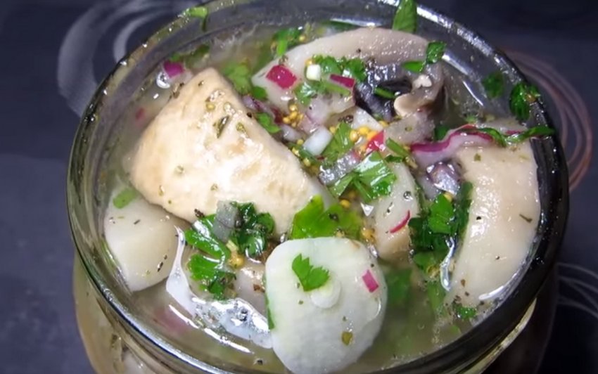Остиглу заготовку перемістіть у холодильник і залиште ще на 8-10 годин, після чого мариновані гриби стануть повністю готові до вживання.![]()