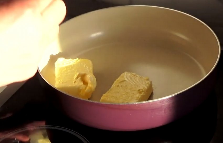 відправити на плиту сковороду, щоб вона нагрілася. Після цього розтопіть маргарин: викладіть 2/3 частини вершкового продукту і дочекайтеся, поки він стане рідкої консистенції.![]()