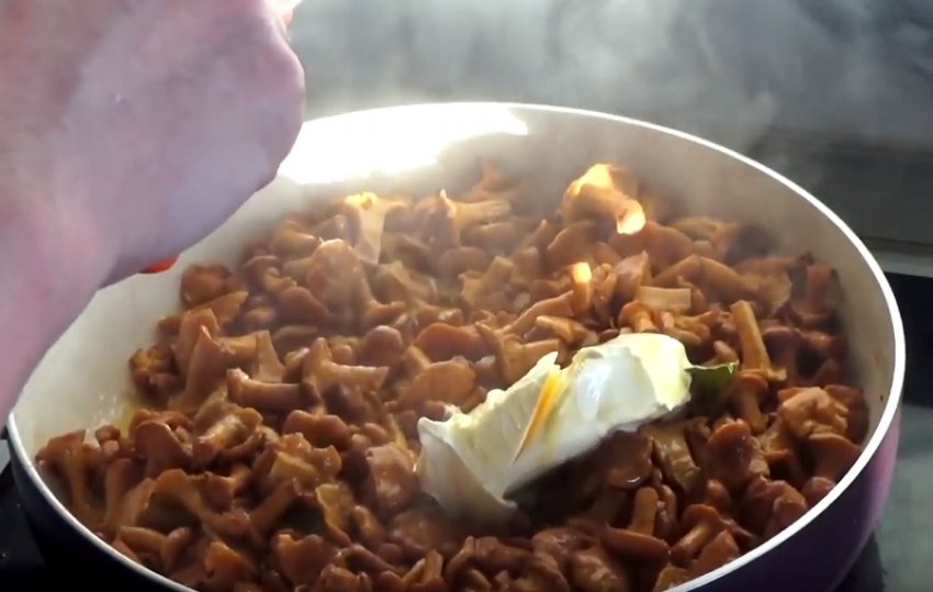 перемішайте вміст посуду й обсмажуйте гриби ще хвилин 10. Через 10 хвилин знімайте сковороду з готовими лисичками з плити.![]()