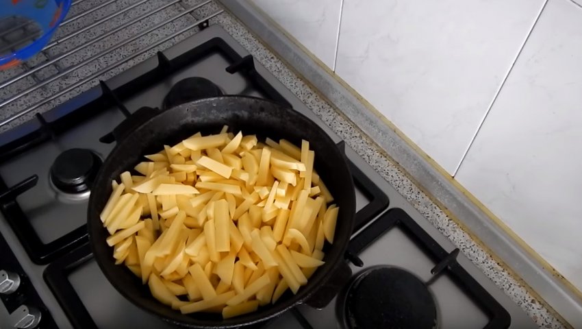 Нарізати картоплю соломкою. Обсмажити до рум'яної скоринки на соняшниковій олії, в процесі перемішуючи.Поки готується картопля, промивати і відкинути на сито гриби.![]()