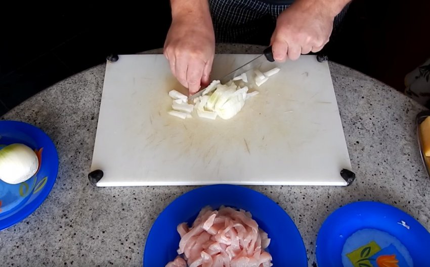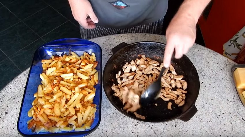 Готову підсолену картоплю викласти у форму для запікання.Далі обсмажити філе на сковороді. Готову курку рівномірно розподілити зверху картоплі, присолити і поперчити.![]()