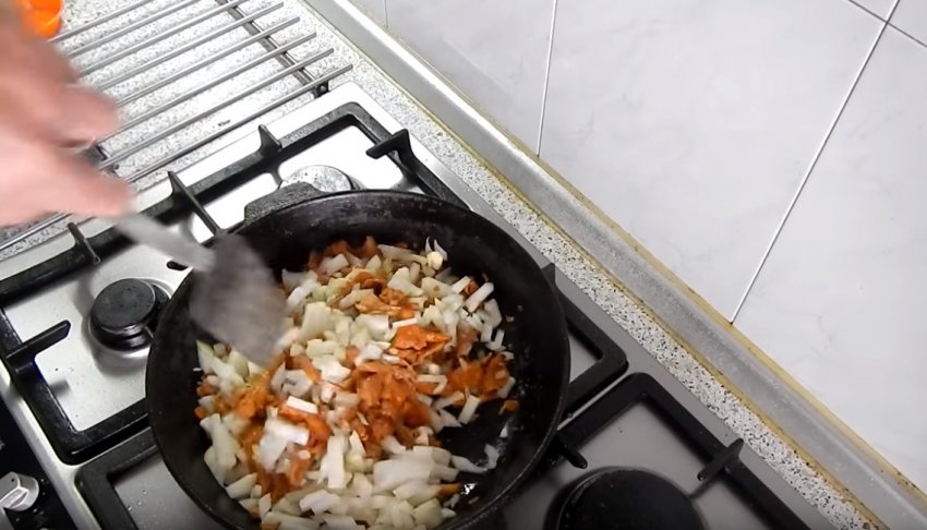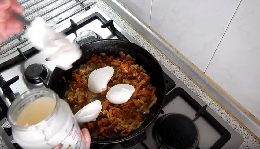 До грибів у сковорідку відправити цибулю, посолити, у напівготовому стані зняти з вогню.![]()