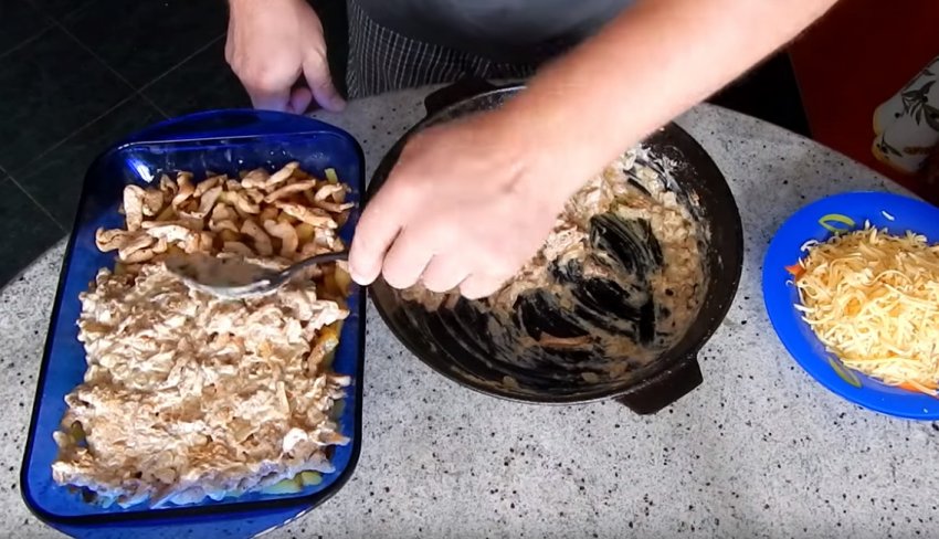 Гриби з цибулею перекласти у форму до курки та картоплі.![]()