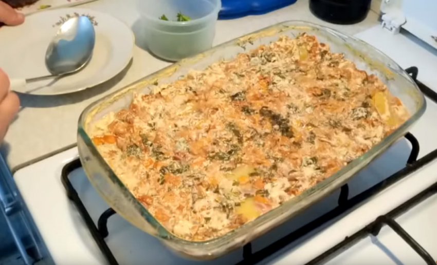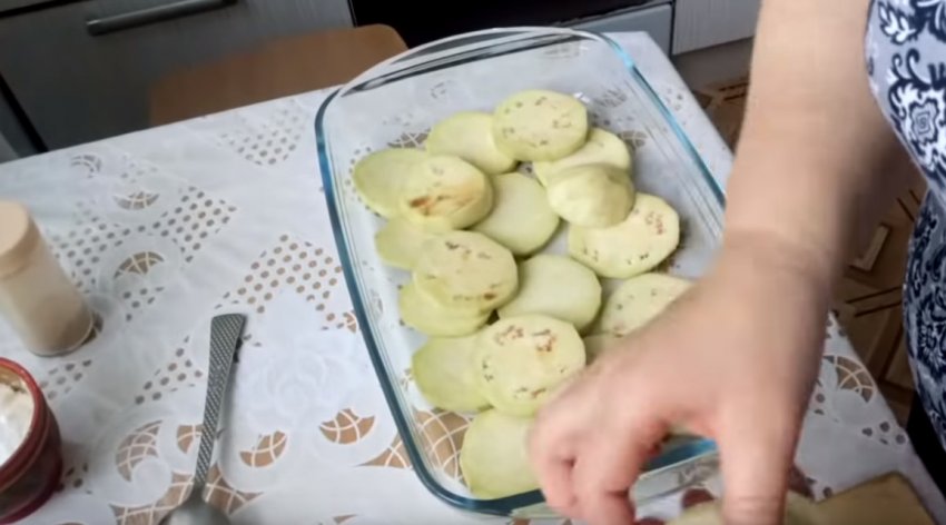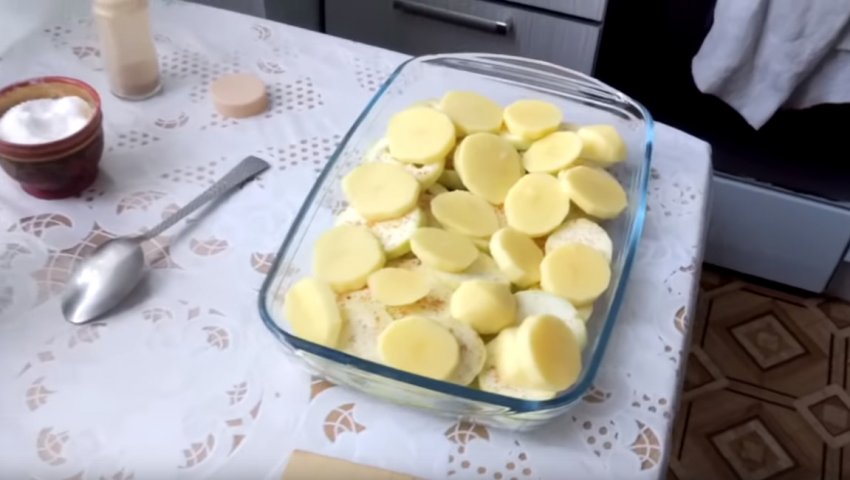 Всі овочі помити і очистити від шкірки, нарізати кружальцями і викласти шарами у форму для запікання.![]()