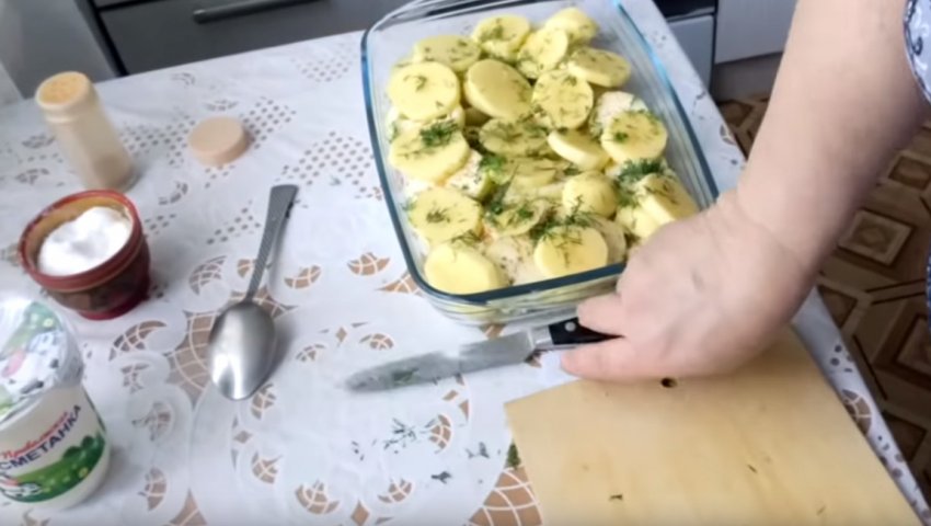 Картоплю нарізати великими скибочками, підсолити, додати решту спецій і вершки. Перемішати.![]()