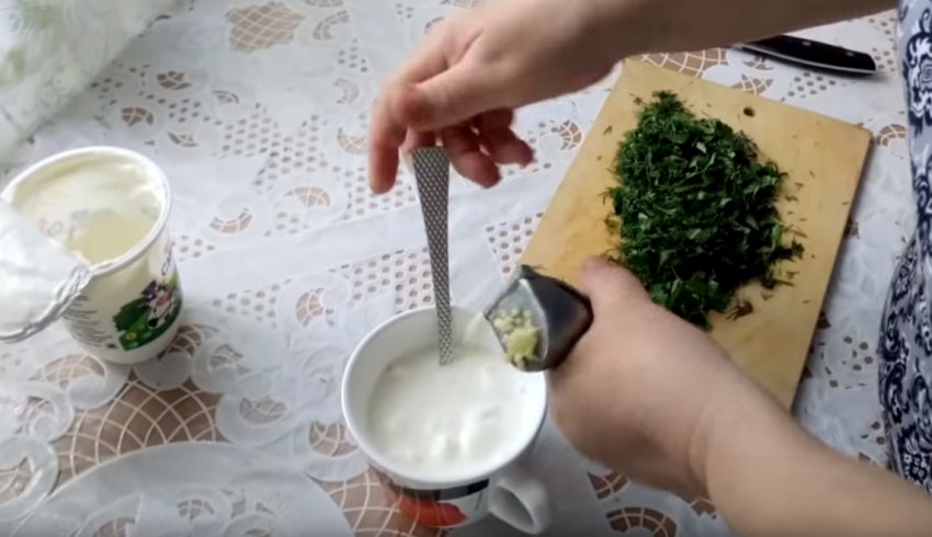 В окремій ємності розвести сметану з водою, додати трохи часнику і зелень, що залишилася.![]()