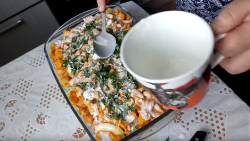 Залити соусом овочі та гриби, готувати в духовці 40 хв. при температурі +200°С.![]()
