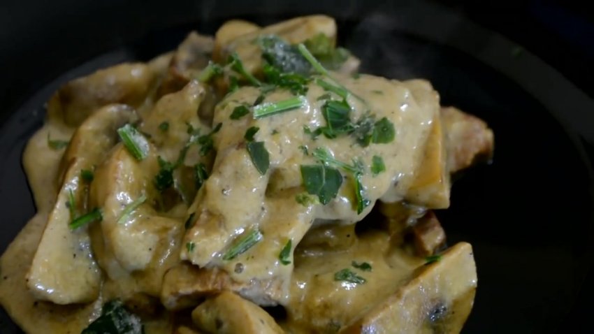 м'ясна страва з грибами буде готова за пів години. Після приготування її можна прикрасити дрібно нарізаною зеленню.![]()