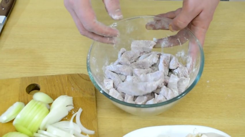 м'ясо висипати борошно для панірування і перемішати руками. Борошно не дасть йому зменшитися в процесі обсмажування і послужить створенню густого соусу.![]()