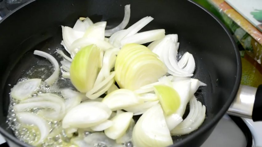 цибулю й обсмажувати на швидкому вогні до появи легкого золотистого кольору.![]()