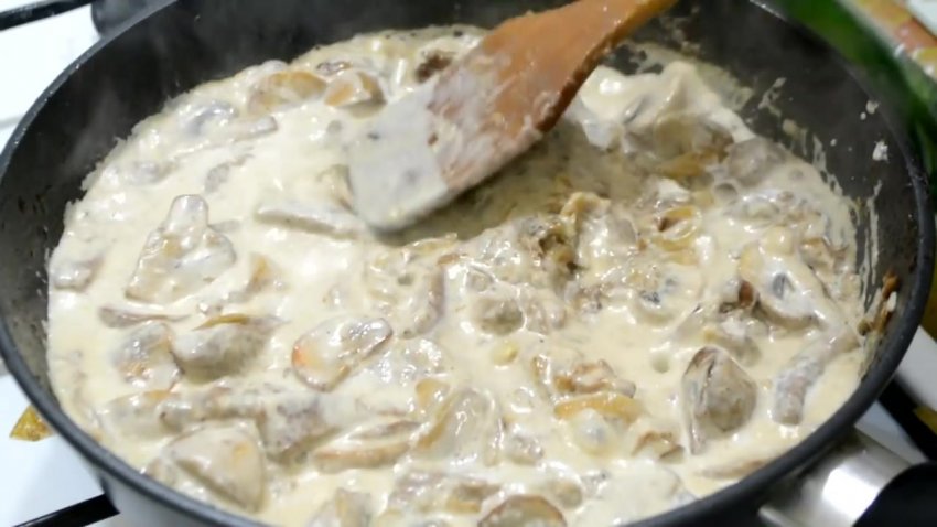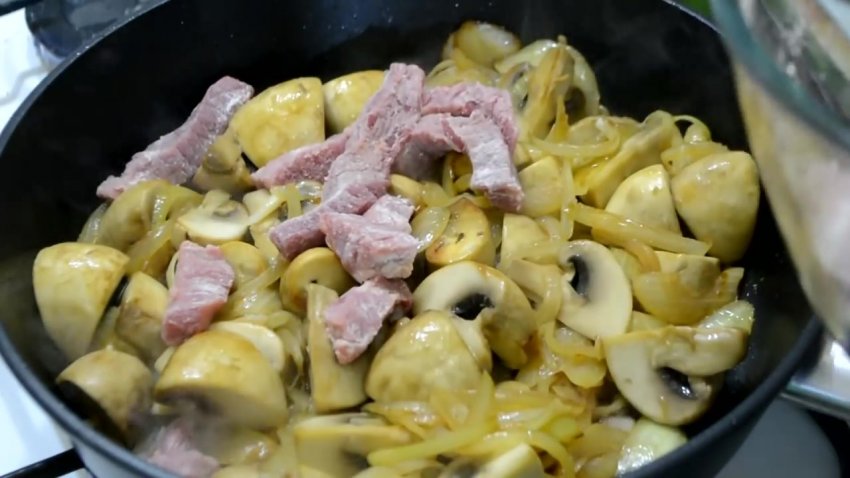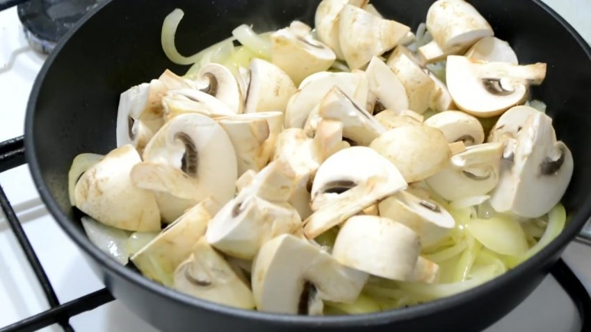 До підсмаженої цибулі додати печериці та продовжувати обсмажувати 5-7 хв. на сильному вогні. Стежити, щоб інгредієнти не підгоріли.![]()