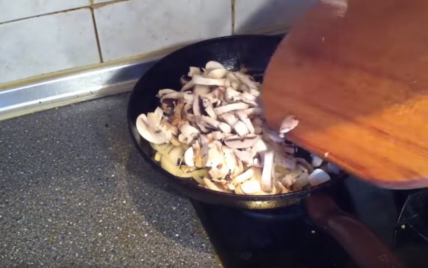 Покладіть на сковорідку подрібнені гриби, а потім підсмажте все до повної готовності. Волога на сковороді при цьому повинна повністю випаруватися.![]()
