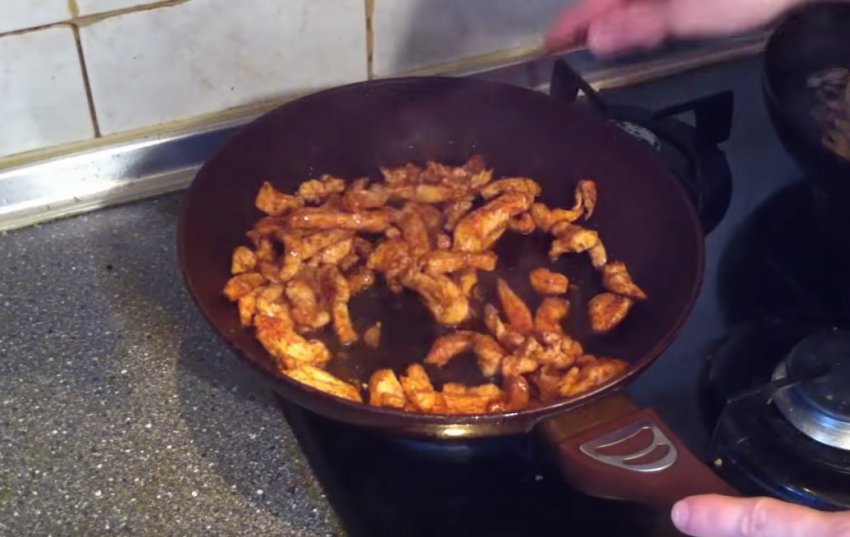 Куряче філе наріжте дрібною соломкою, посоліть його і добре посипте спеціями (перець, паприка, коріандр).Відставте м'ясо в бік маринуватися на 15-30 хвилин.![]()