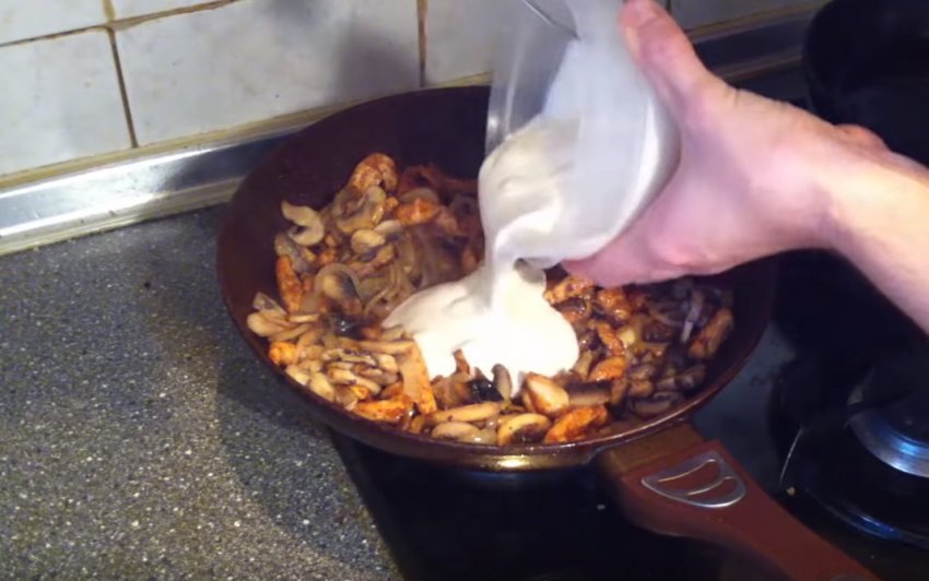 Поставте вогонь на мінімум, а потім вилийте до продуктів сметану і все ретельно перемішайте.Додайте до грибів, цибулі і курки сіль, а також спеції за смаком, після чого протушкувати під кришкою близько 15 хвилин.![]()