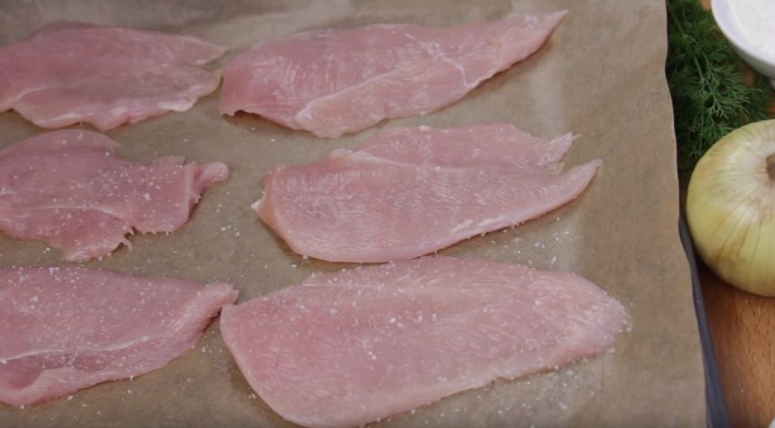 Розріжте кожну частину філе на окремі фрагменти, а потім кожен з них розділіть навпіл (уздовж). В результаті повинні вийти великі, але тонкі шматочки.Кожен шматок грудинки потрібно посолити і посипати спеціями за смаком, а потім залишити в сторону на 15-20 хвилин.![]()