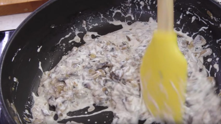 Додайте до цибулі і грибів майонез, сметану, половину натертого сиру, сіль і спеції за смаком. Перемішайте все і приберіть з вогню.![]()