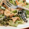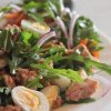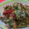 - Салат порвати руками, частину листя салату викласти в салатницю, решту змішати з теплою обсмаженою масою і викласти в салатник зверху.