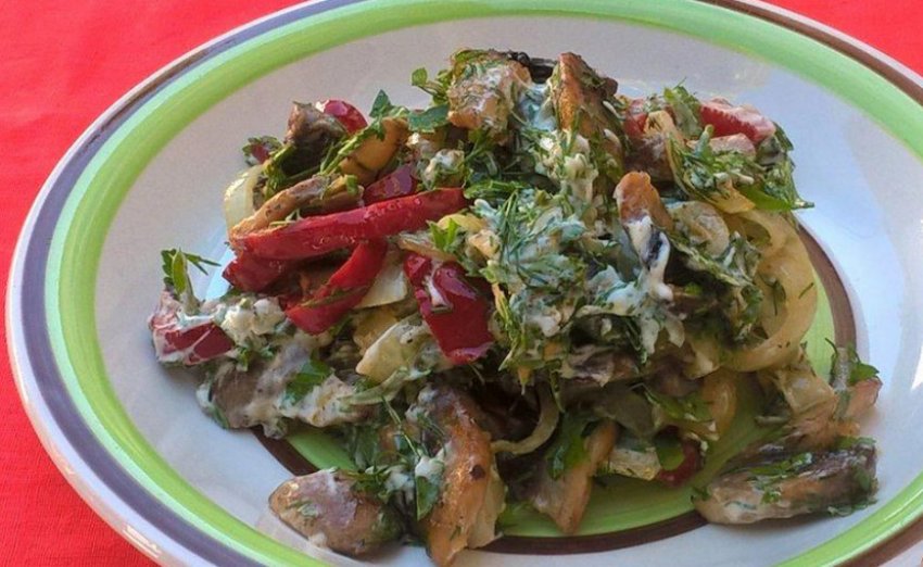 Заправити інгредієнти сметаною, посолити і поперчити за смаком, дати настоятися близько години.![]()