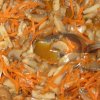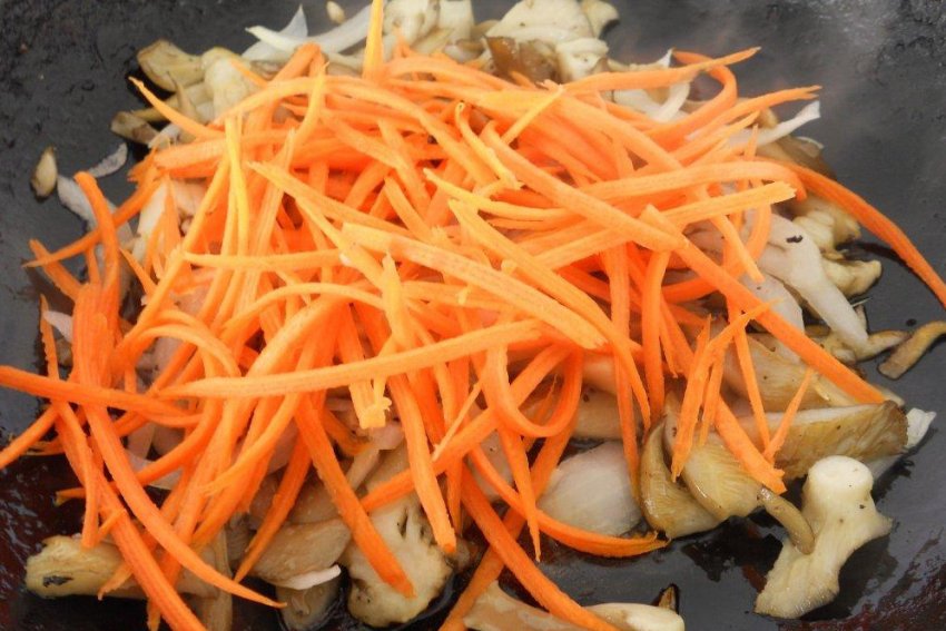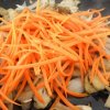 - Натріть на "корейській" тертці моркву і всипте її до грибів, ретельно перемішайте.