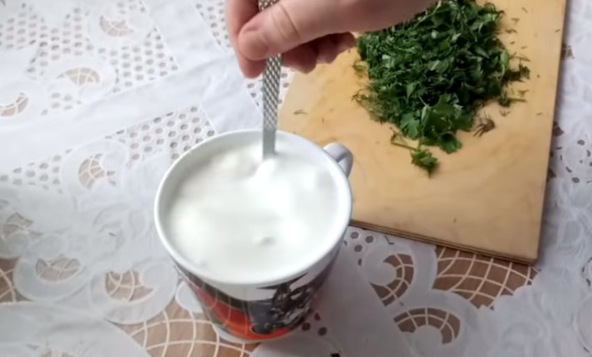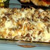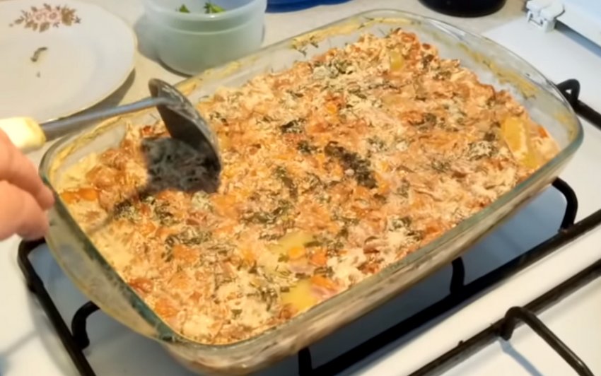 - Зверху на сметану викласти протушкувалися на сковороді продукти і прим'яти.