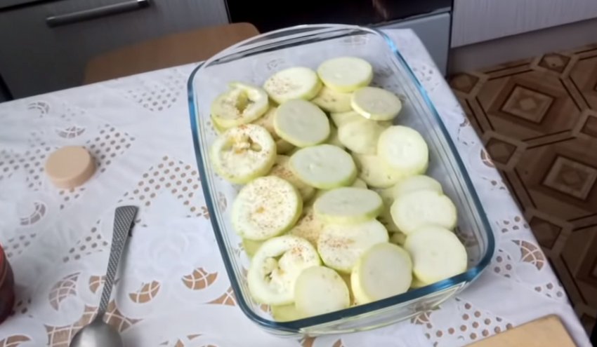 В чисту форму викласти шарами баклажан, кабачок, картопля, зелень (1/3), цибуля, гриби. Кожен шари солити і перчити за смаком.![]()