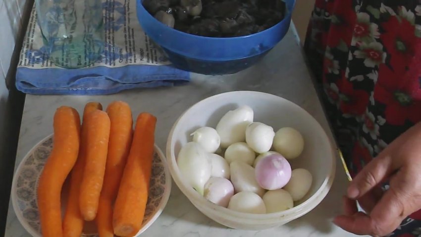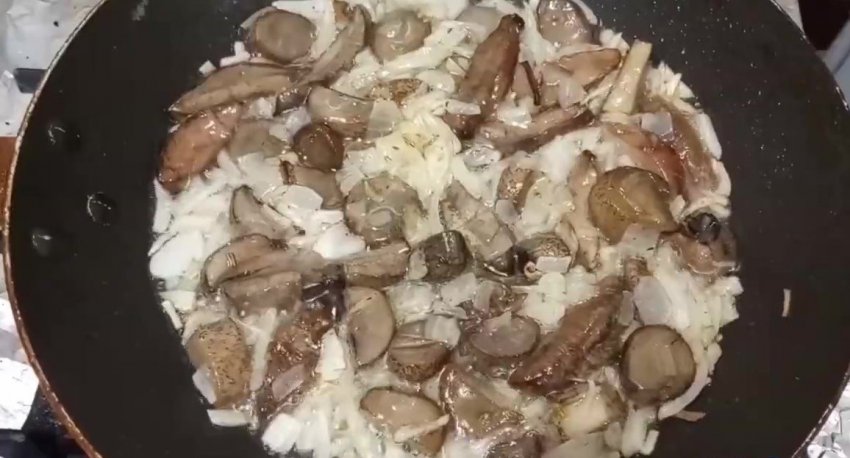 і моркву підсмажити на розігрітій із соняшниковою олією сковорідці до напівготовності. Окремо на сковорідці просмажити гриби приблизно 30 хвилин.![]()