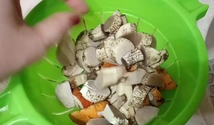 Підготовлені підосичники порізати невеликими шматочками, потім відкинути на друшляк і промити під краном.![]()
