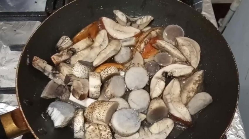 На розігріту пательню з соняшниковою олією кинути нарізані гриби і трохи посолити їх. Хвилини 3 смажити на сильному вогні. Щоб олія не стріляла, закрити сковорідку кришкою. подосиновики швидко пустять сік.![]()
