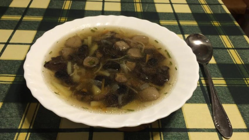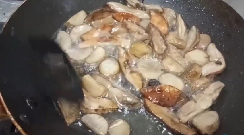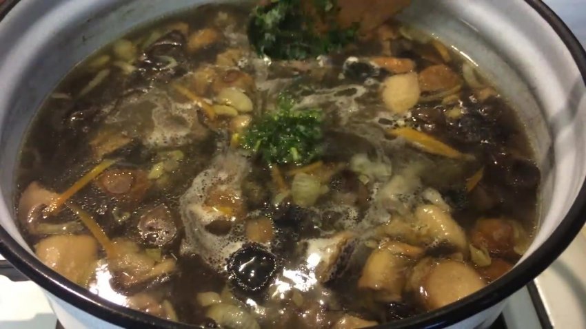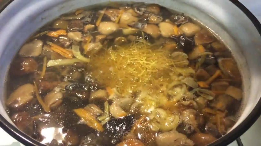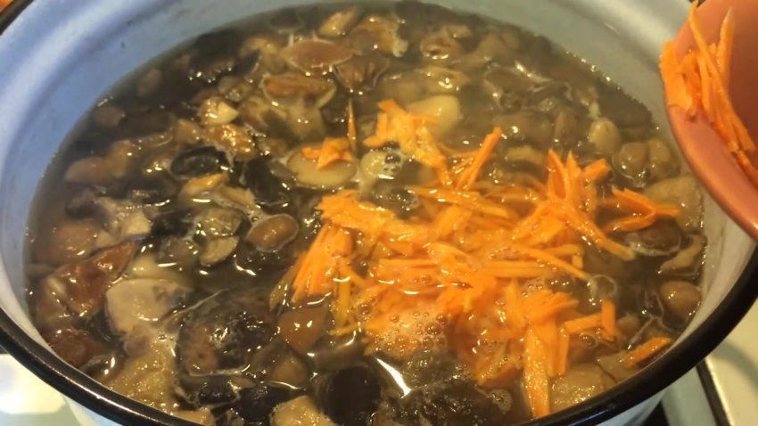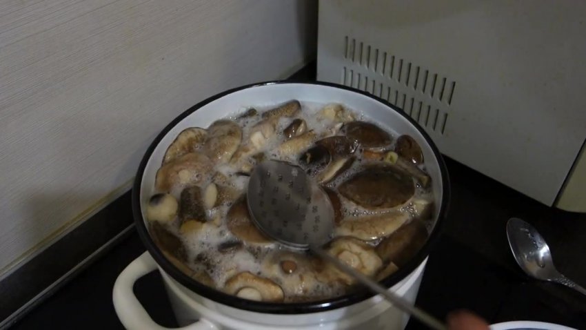 Налити в каструлю 3,5 л води і кинути відварені гриби. Поставити на вогонь і довести до кипіння. Коли вони закиплять, зняти піну. Варити 25 хвилин, періодично прибираючи піну.![]()