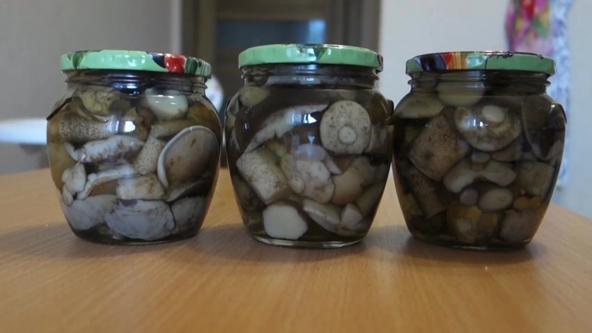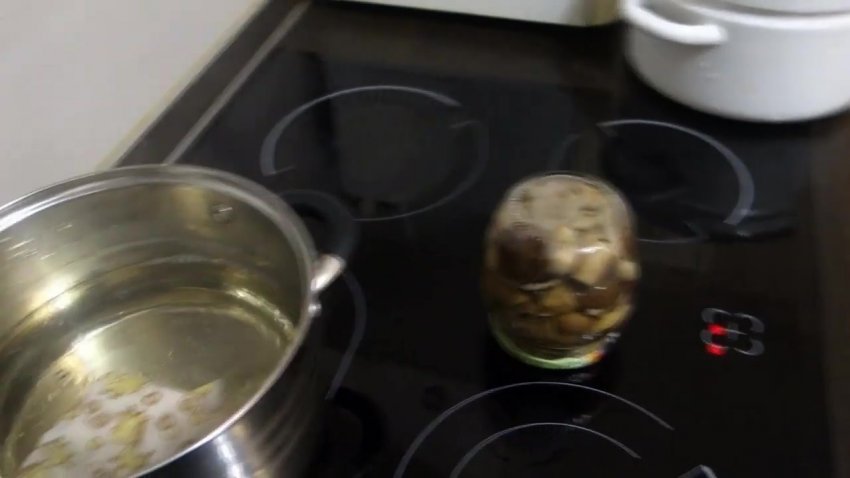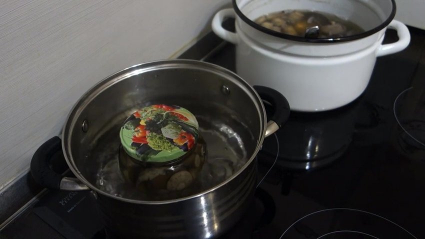 Спочатку в тару перекласти гриби, потім залити їх гарячою рідиною. У каструлю налити гарячу воду і помістити на її дно тканинну серветку, поставити на вогонь. Банки прикрити кришками і поставити в каструлю з водою, довести воду до кипіння і на тихому вогні стерилізувати 8-10 хв.![]()