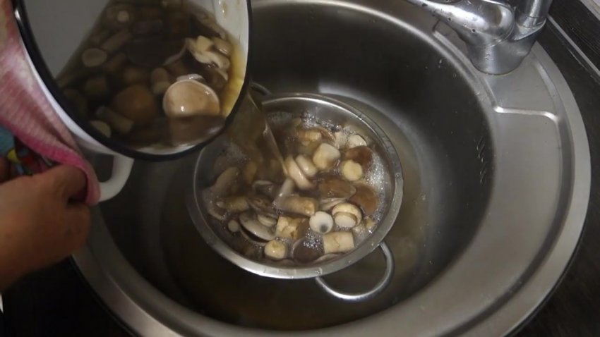Відкинути гриби на друшляк, зливши воду, і промити водою з крана. Простерилізувати півлітрові скляні банки та кришки до них.![]()