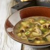 - Поки готується бульйон, слід підготувати засмажку. Для цього цибулю нарізають дрібними кубиками, моркву натирають на тертку, а гриби, попередньо промиті, слід нашаткувати тонкими скибочками. Після цього цибулю викладають на розігріту сковорідку й обсмажують. Коли з'явиться легка золотистість, потрібно додати моркву та гриби. Залишити на середньому вогні на 10 хвилин, періодично помішуючи.