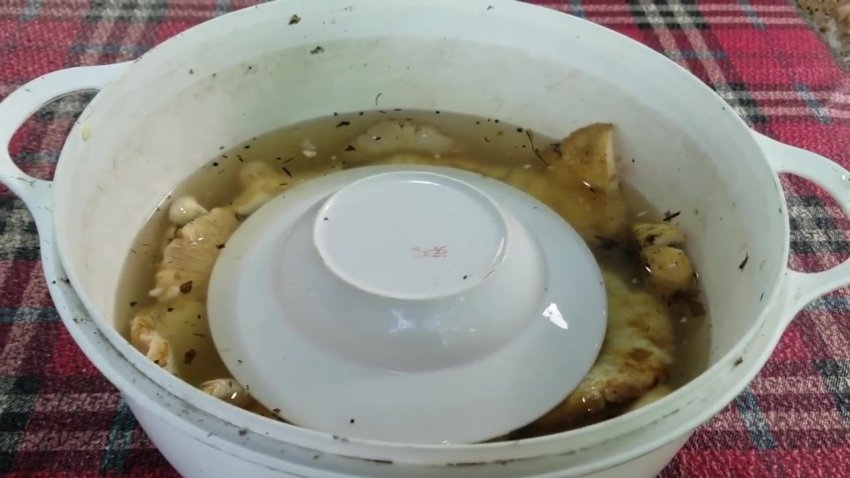 Зверху гриби накрити тарілкою і поставити під гніт на дві доби.![]()