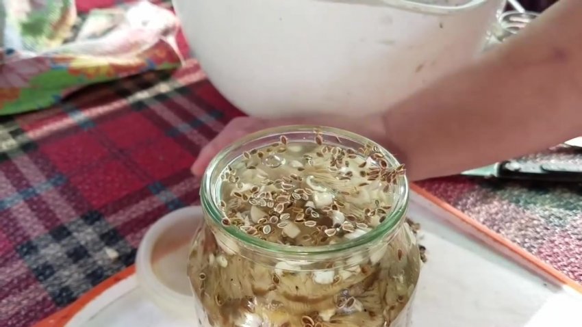 Потім гриби шарами (скільки увійде), пересипаючи подрібненим часником і насінням кропу, укласти в ємність, щільно утрамбовуючи.![]()