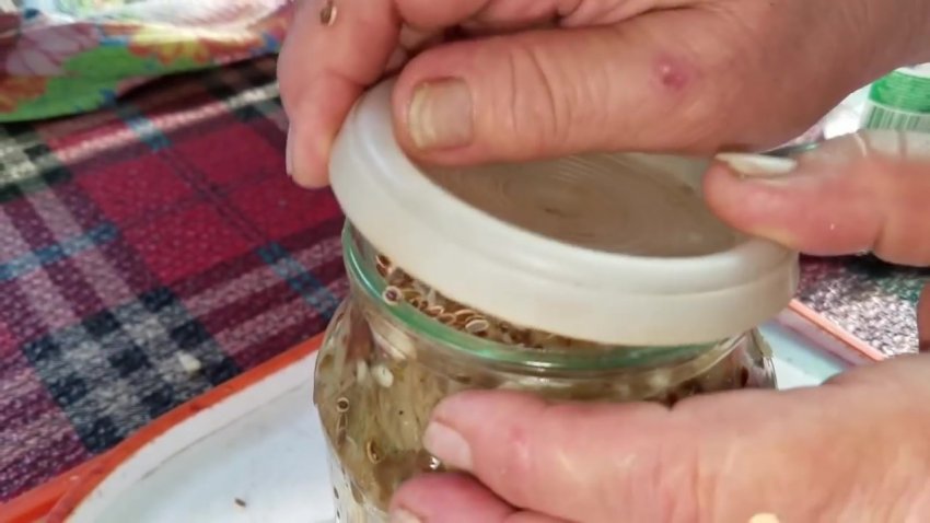Коли маса осяде, додати ще капелюшки і долити кип'ячену холодну підсолену воду до верху банки. У результаті має поміститися вся сировина. Ножем зсередини по стінках банки проткнути заготовку, щоб вийшло повітря і розсіл рівномірно розподілився по всьому об'єму.![]()