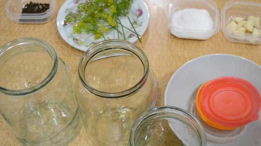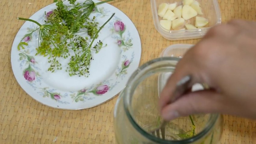 На дно банок 0,7 л укласти кріп, часник, лавр і перець.![]()