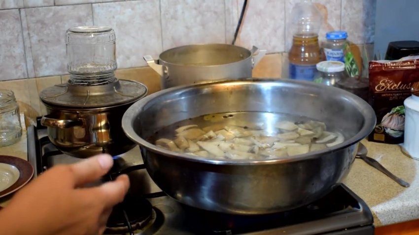 У велику каструлю помістити вже відстояні від гіркоти гриби, залити водою, щоб плавали.![]()