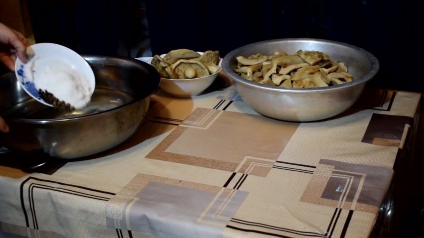 Після шумівкою, щоб стекла зайва вода, перекласти гриби в іншу ємність, пересипаючи кожен шар дрібкою солі.![]()