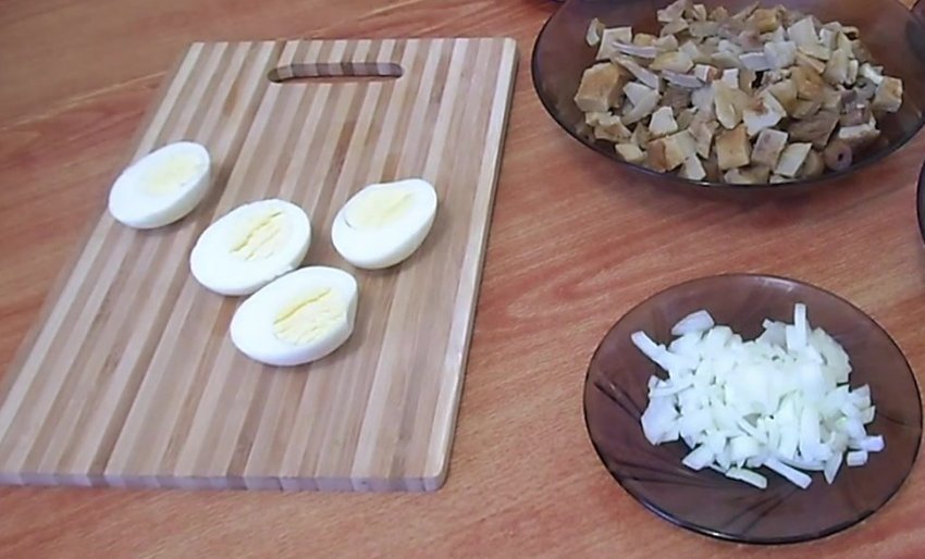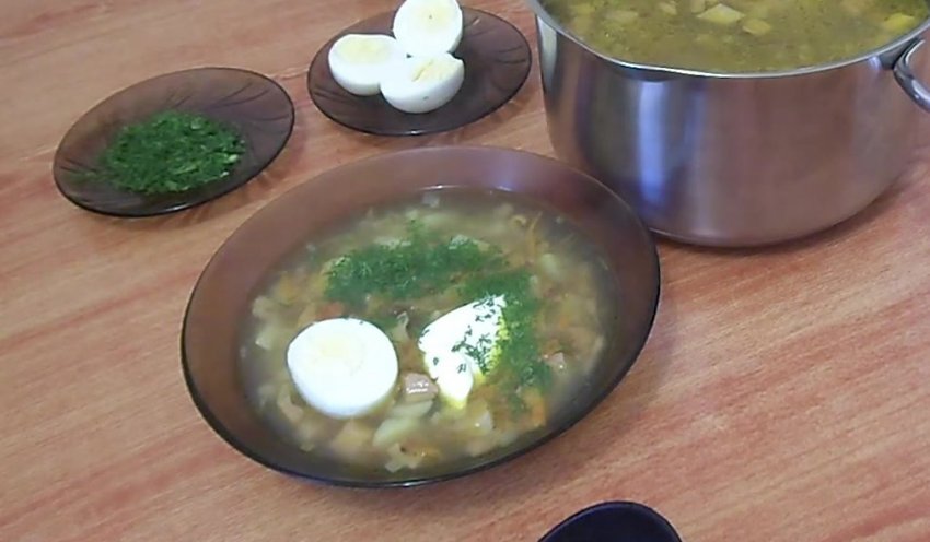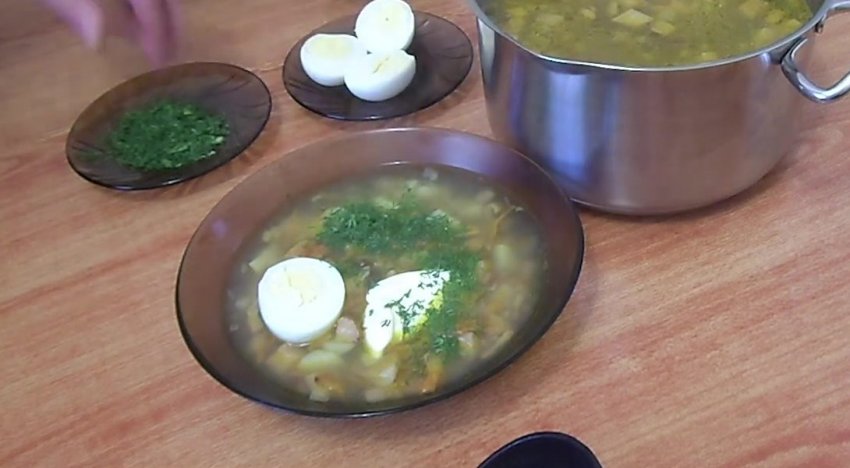 Для подачі в тарілку кладуть чверть вареного яйця і ложку сметани.![]()