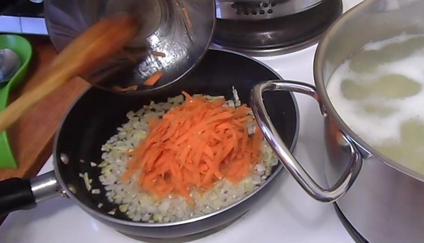 Моркву і цибулю обсмажити до зміни кольору соняшникової олії.![]()