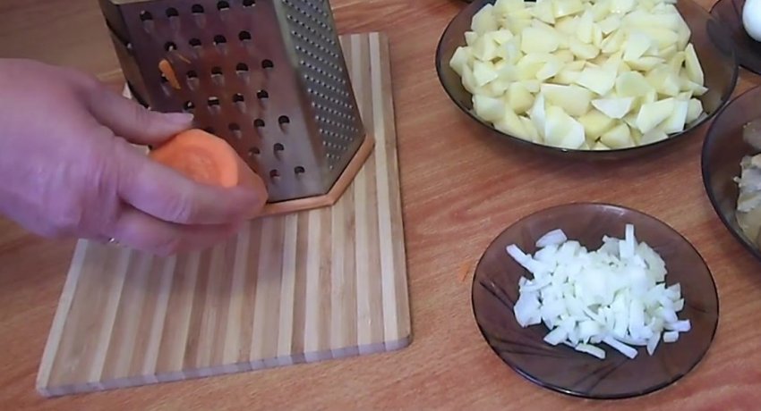 На вогонь поставити каструлю, налив 2 л води. До закипання рідини нарізати довільними шматками картоплю, кубиками цибулю і моркву.![]()
