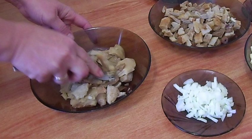 Грузді промити, щоб видалити зайву сіль. Чверть від усієї маси грибів розім'яти за допомогою виделки, а решту покришити великими скибочками.![]()