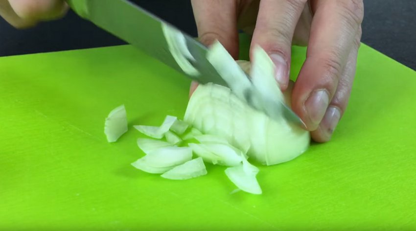 - Пасерувати подрібнену цибулю на сковороді з рослинною олією.