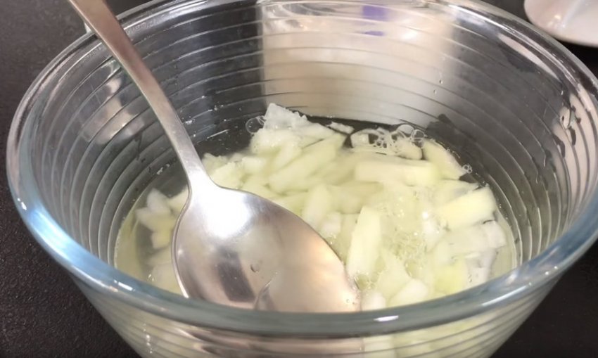 Подрібнити цибулину і висипати в окрему ємність. Додати сіль, цукор, оцет і окріп.![]()