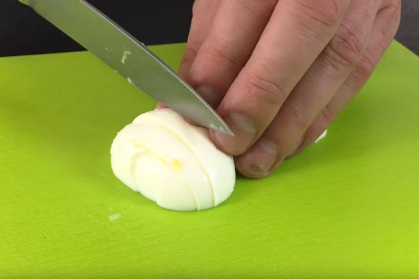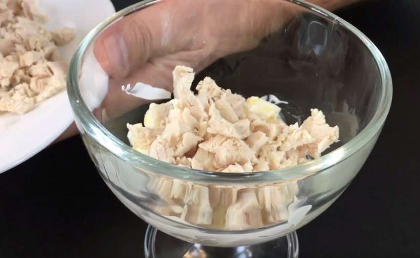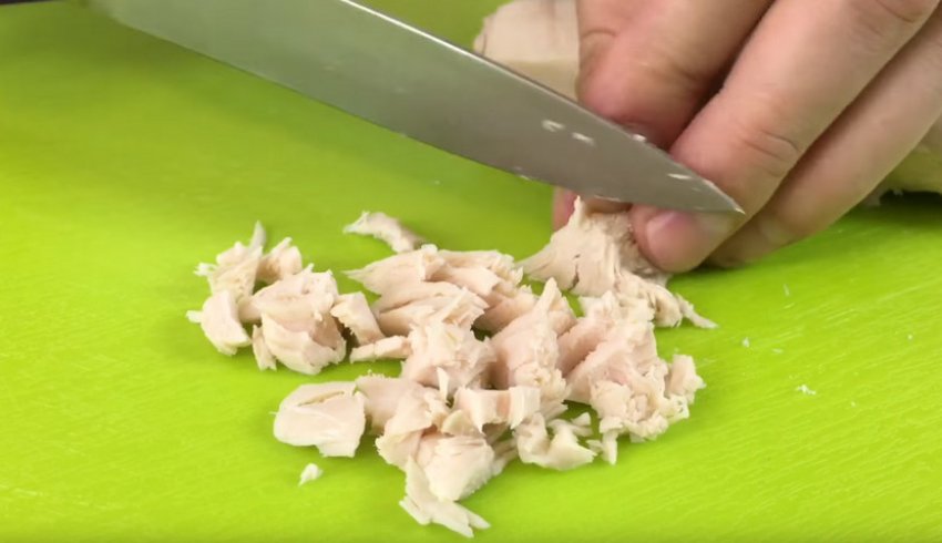 Відварити філе в підсоленій воді з додаванням горошків перцю. Не виймаючи з води, дати йому охолонути. Дрібно порізати.![]()