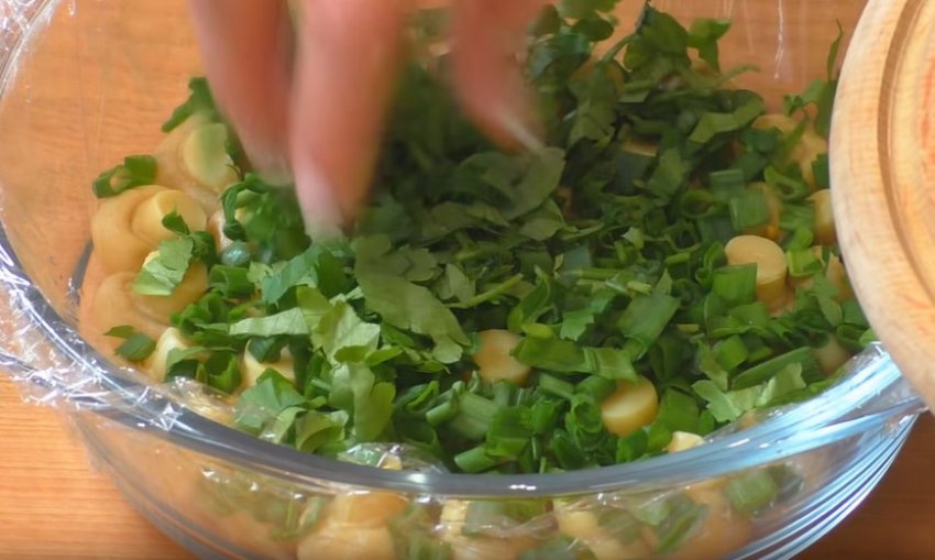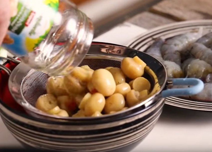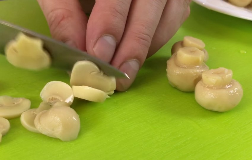 Перед приготуванням гриби потрібно вийняти з банки з маринадом, промити, обсушити і порізати способом, зазначеним у рецепті.