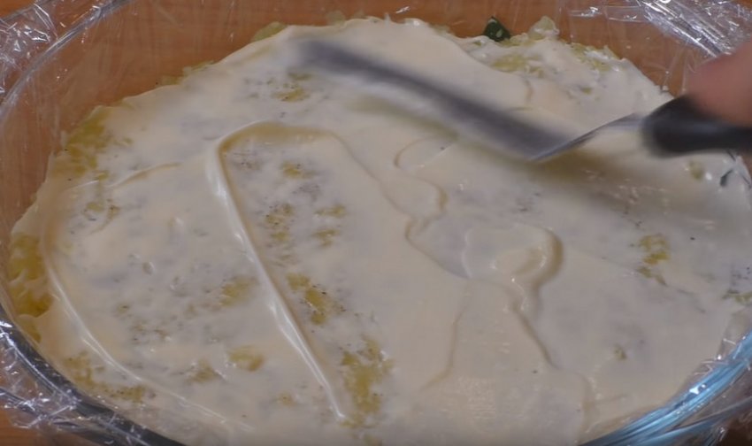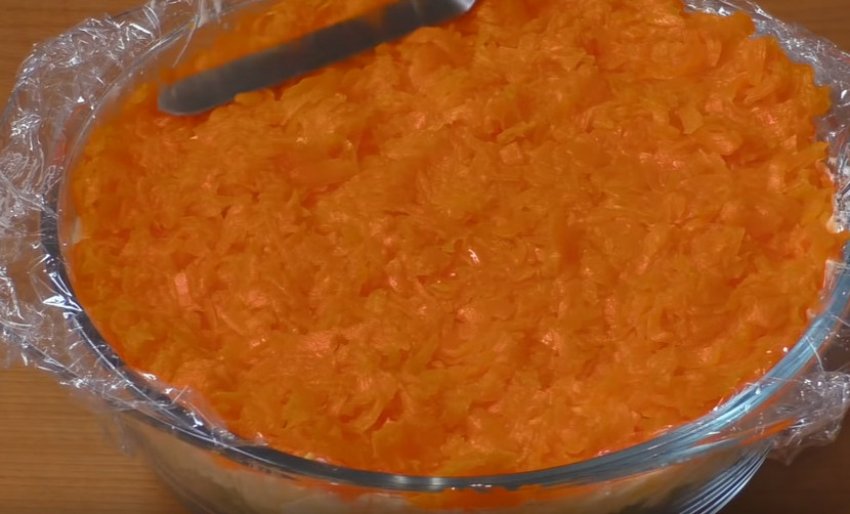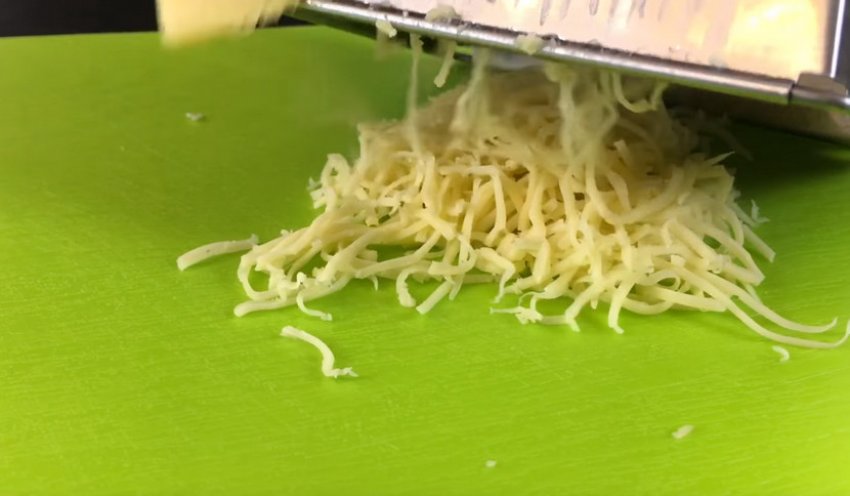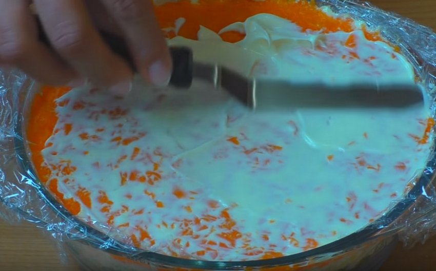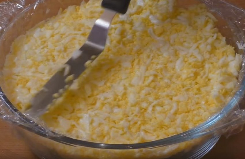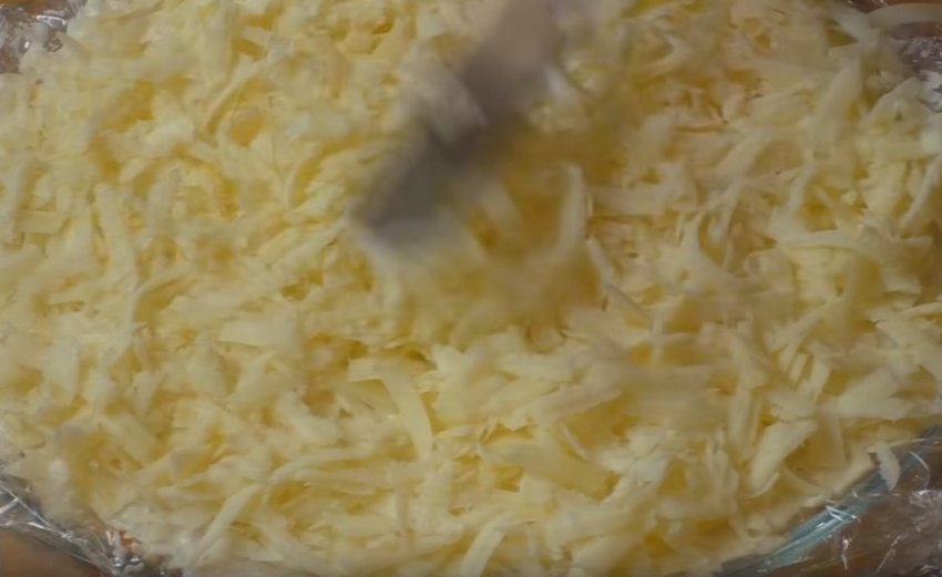 Змастити майонезом. Викласти рівним шаром натертий сир.![]()
