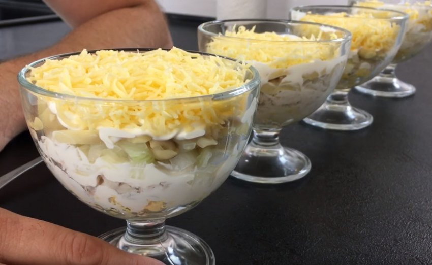 Інгредієнти потрібно укласти тонкими шарами, змащуючи кожен із них майонезом. Рекомендована послідовність: яйця, курка, цибуля, гриби, сир.![]()